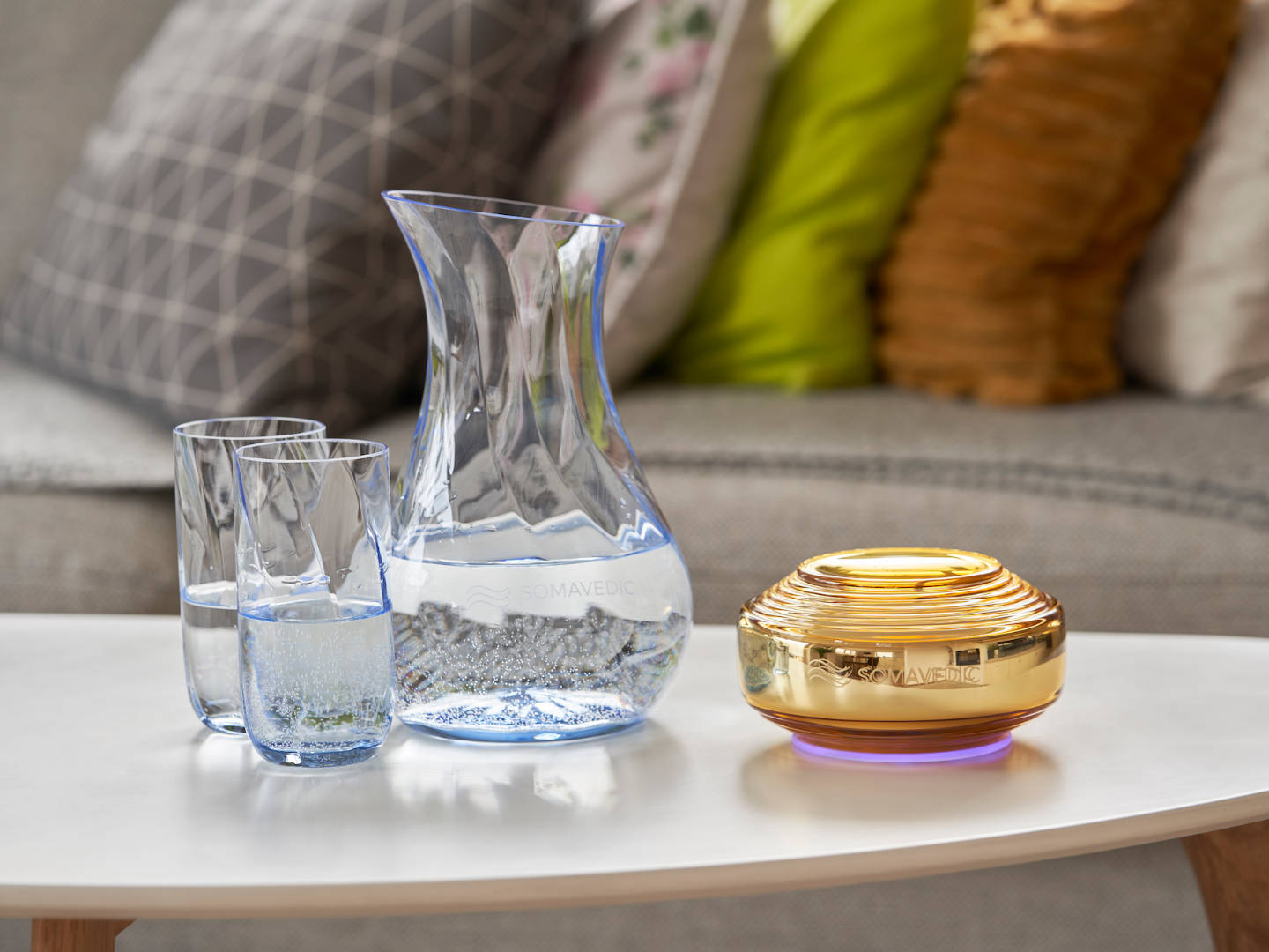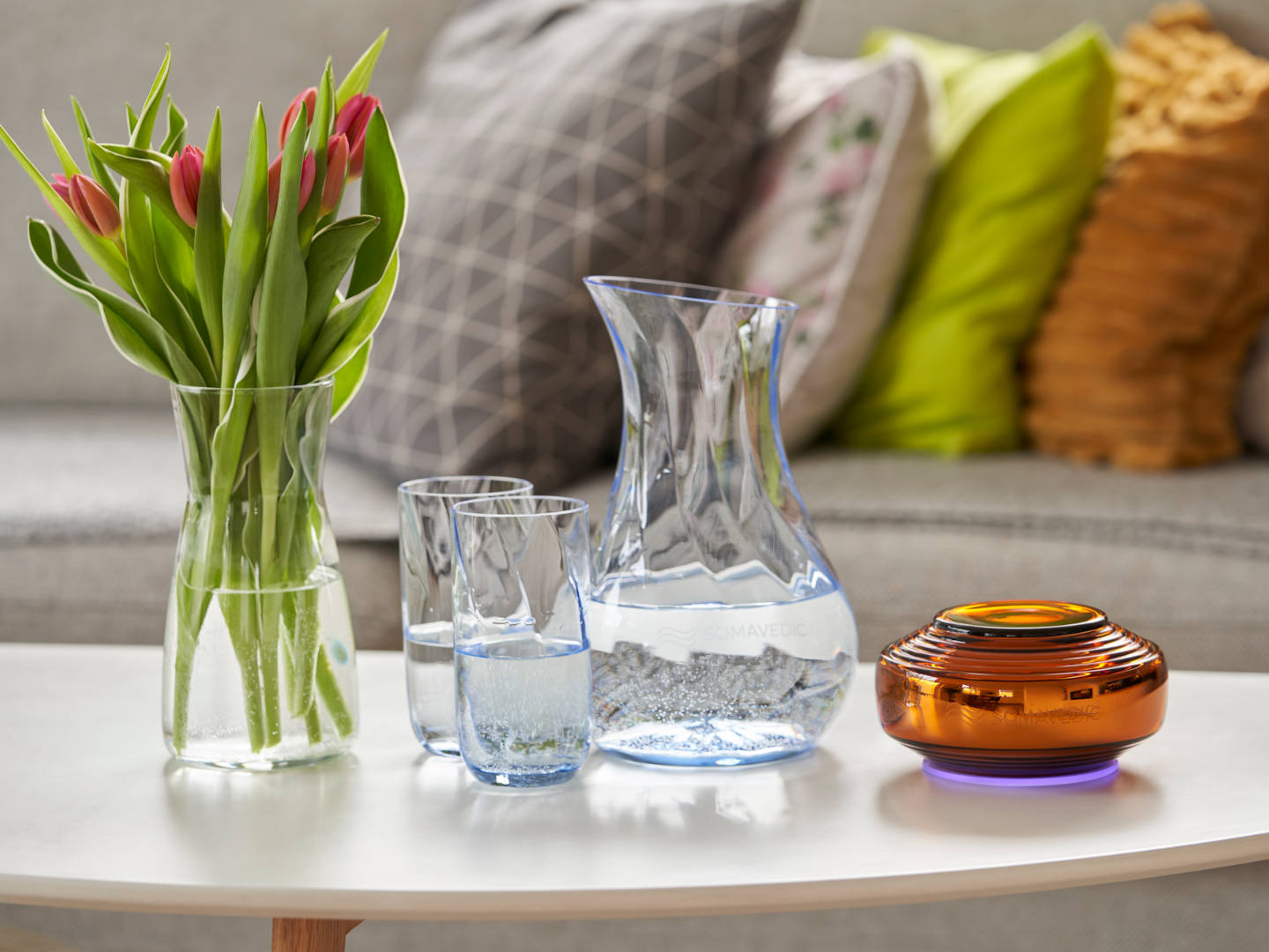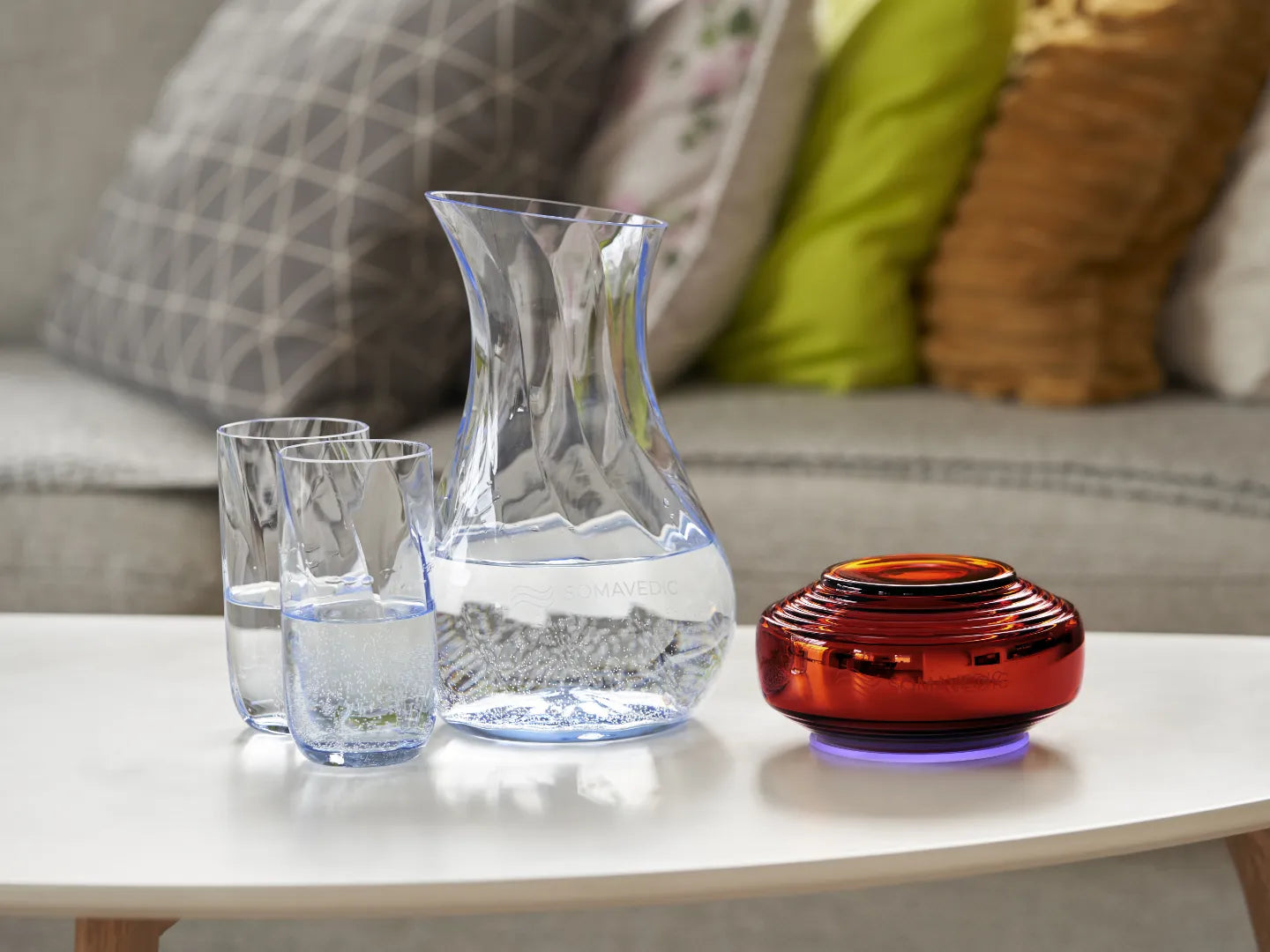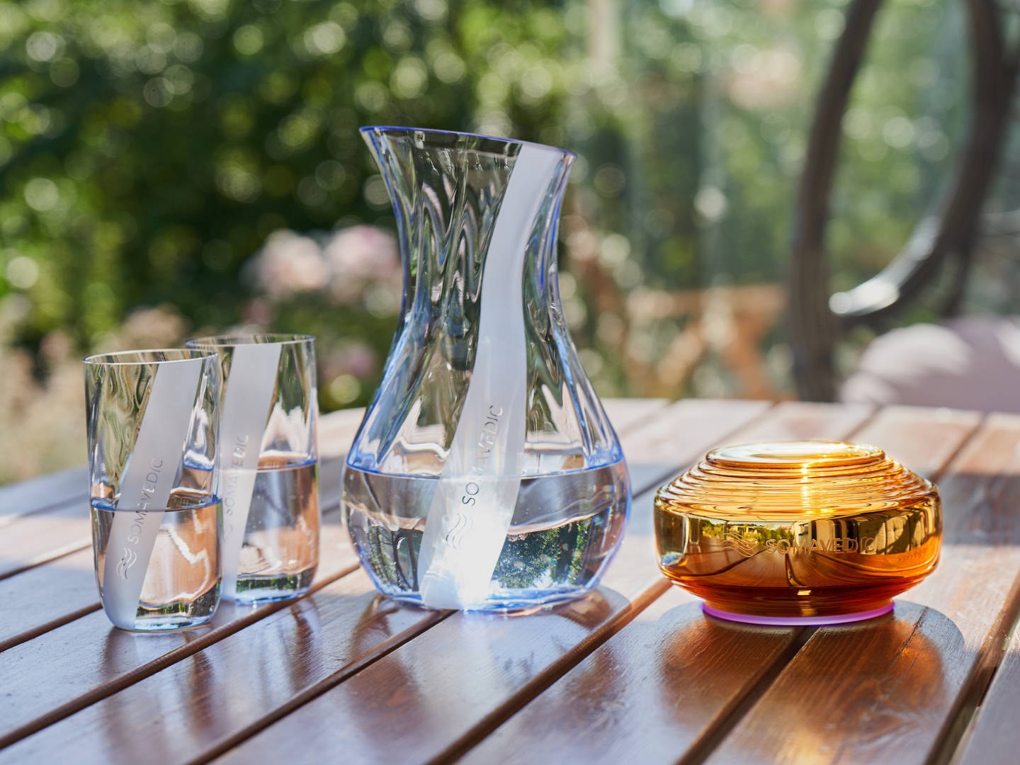 Il modello Amber è in grado di creare acqua strutturata armonizzata, aumentandone così la capacità di idratazione. Per ottenere il massimo assorbimento mediante l’acqua strutturata, posiziona il contenitore d’acqua alla distanza ideale di 20 cm (8 pollici) dal dispositivo Somavedic. L’acqua strutturata raggiunge il 100% di effetto desiderato entro 10-15 minuti. Con il modello Amber puoi concederti senza compromessi la qualità dell’acqua di sorgente.