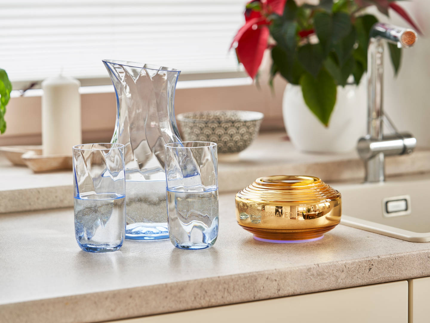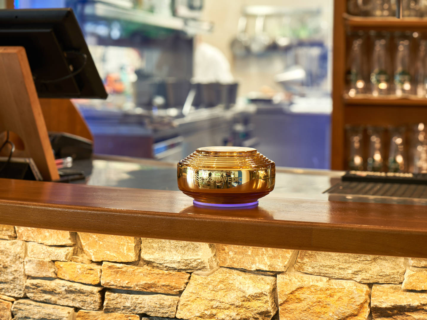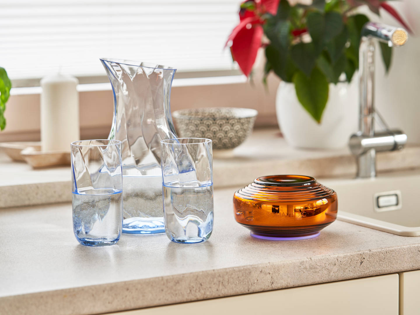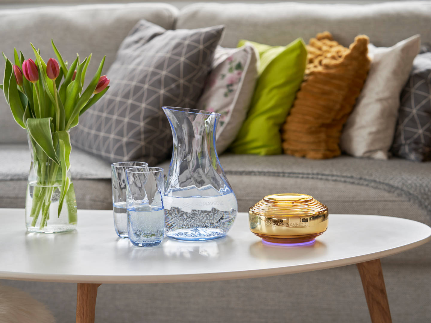Il modello Amber è in grado di creare acqua strutturata armonizzata, aumentandone così la capacità di idratazione. Per ottenere il massimo assorbimento mediante l’acqua strutturata, posiziona il contenitore d’acqua alla distanza ideale di 20 cm (8 pollici) dal dispositivo Somavedic. L’acqua strutturata raggiunge il 100% di effetto desiderato entro 10-15 minuti. Con il modello Amber puoi concederti senza compromessi la qualità dell’acqua di sorgente.