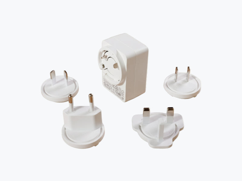 Power adapter with four interchangeable plugs for worldwide compatibility.